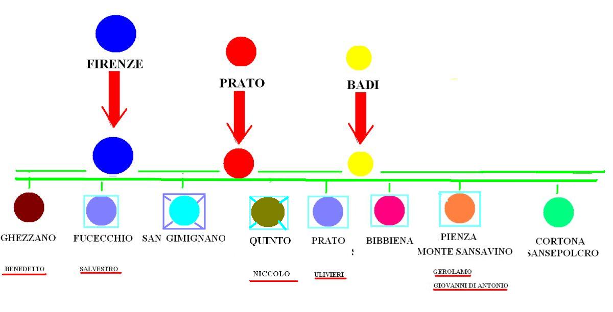 La fortuna di questa ricerca e' che le varie vicende del cognome , le nascite ,i battesimi ,i matrimoni si svolgono in TOSCANA , meravigliosa terra ed autentica miniera di documentazione preziosa sulla vita delle persone. Terra che ha potuto fino al tristo Clemente VII , vivere libera e priva di quella NOBILTA' mortifera , che altrove AMMORBAVA e MORTIFICAVA le terre d'Italia . Dove era presente solo un ceto dirigente che seppe mantenersi spiritualmente libero fino almeno a mezzo cinquecento
