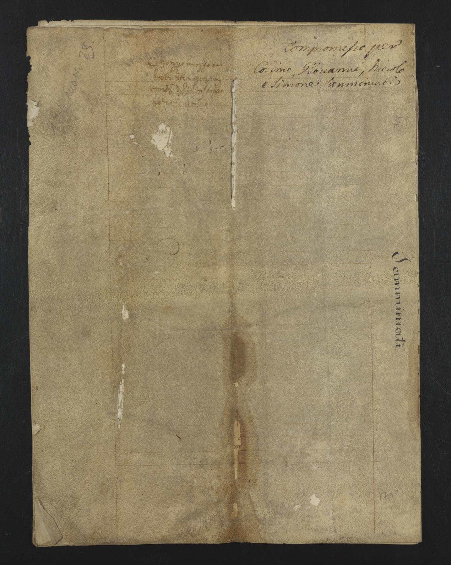 Legal decision by judge Bernardo di Andrea Carnesecchi of Florence concerning the dispute between the brothers Cosimo, Giovanni, Niccolo`, and Simone di San Miniato over the estate left by their father, Bartolomeo di Bartolomeo di San Miniato. Notarized by Francesco di Giovanni Anselmi of San Miniato on 23 March 1516. Filed with the document is a short, later summary written in Italian on paper.