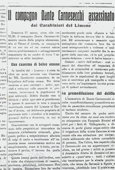Dante Carnesecchi qualifié comme " d’une force herculéenne " était selon son compagnon Abele Ricieri " une des plus belles figures de l’anarchisme individualiste…un solitaire qui avait peu d’amis…un volcan impétueux et critique dans les débats " (cf. Il Libertario, 7 octobre 1920), fut assassiné le 27 mars 1921 à Termo d’Arcola par un groupe de sept carabiniers, alors qu’il sortait de chez lui avec son oncle Azeglio et un ami, Franceschini. Les trois hommes avaient été violemment frappés avant que Dante ne soit froidement abattu par le brigadier des carabiniers qui prétendra avoir agi en légitime défense et dont la version reprise par la presse conservatrice sera dénoncée le 29 mars par Lucia Carnesecchi (née Fontana, 1862-1942) la mère de Dante.