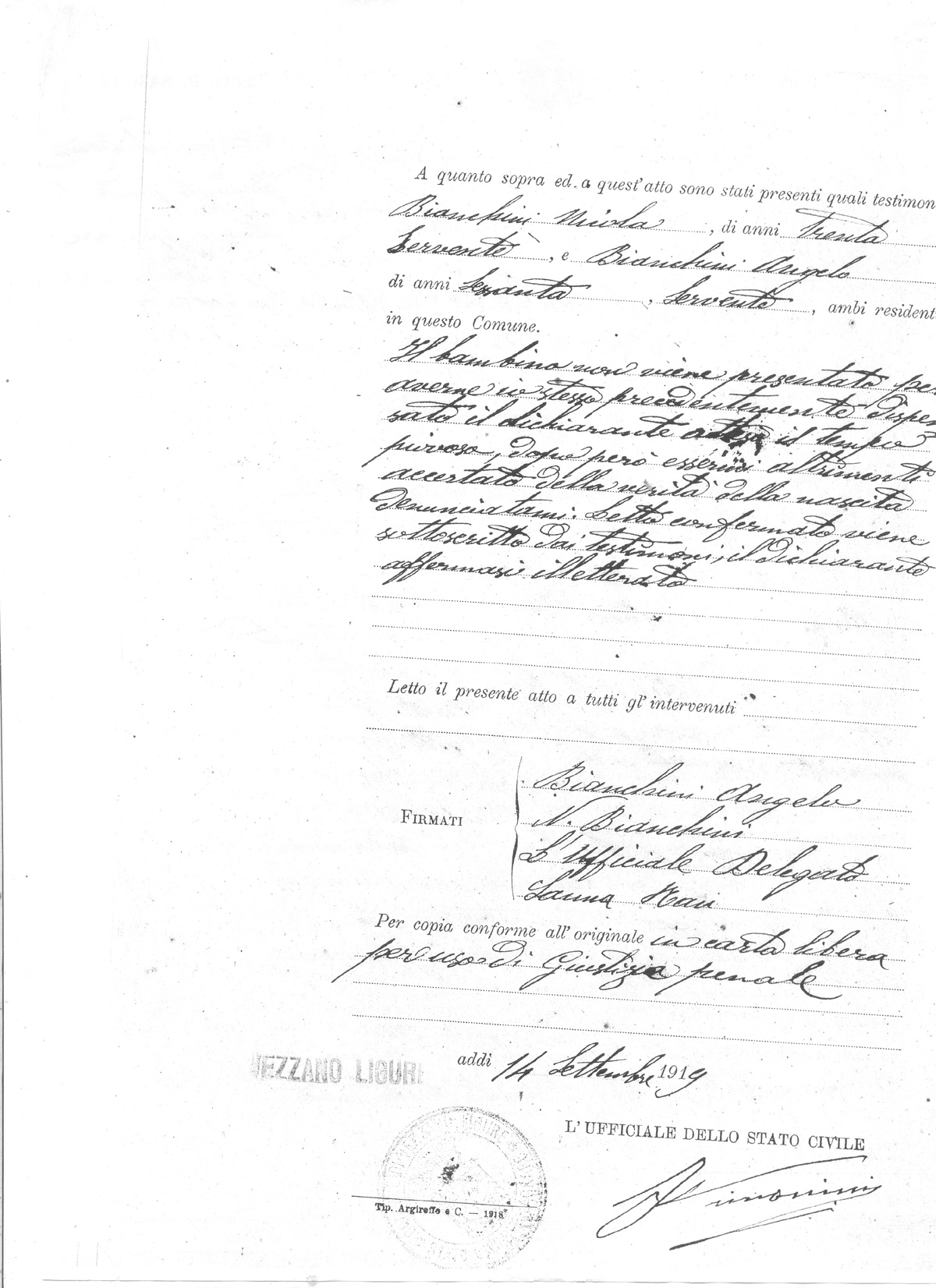 Le 13 juin 1919 il aurait participé à la manifestation de Santo Stefano Magra où avait été tué un carabinier, du meurtre duquel il fut finalement innocenté par la Cour d’Assises.