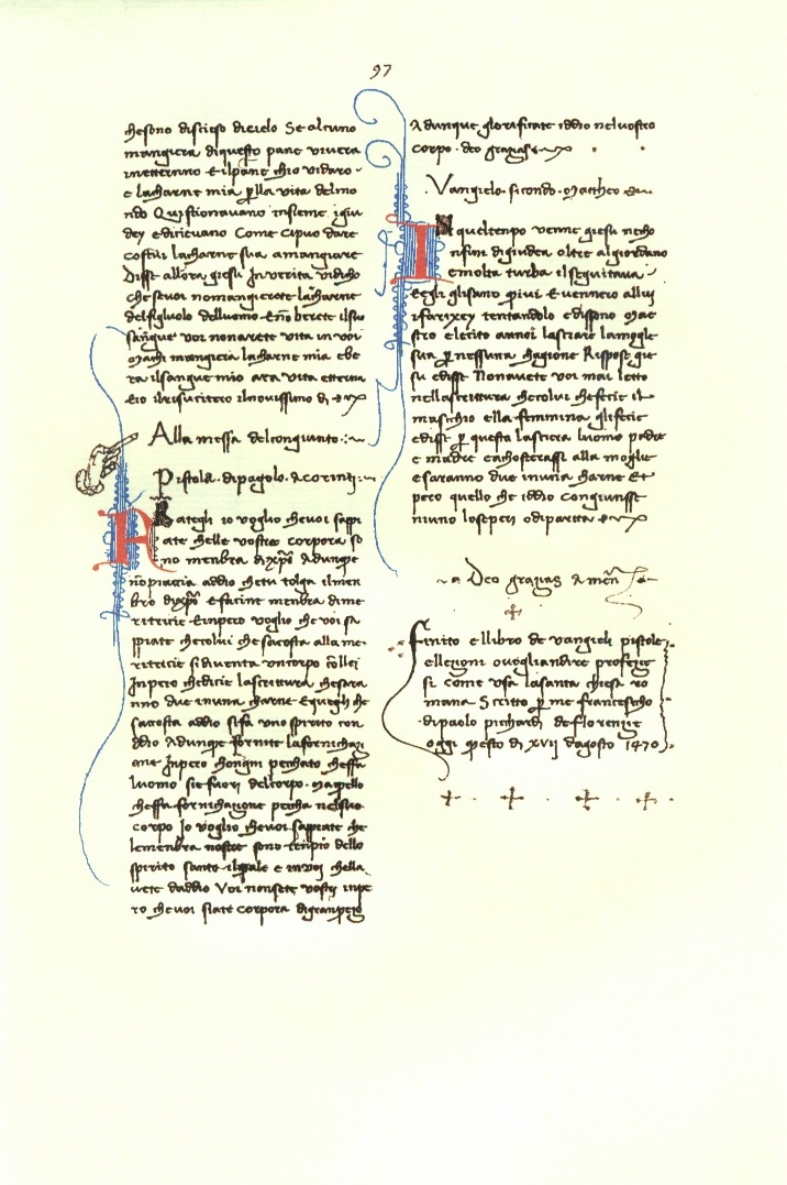 cheffa fornichazione peccha nelsuo corpo Io voglio che voi sappiate che lemenbra nostre sono tenpio dello spirito santo il quale e in voi chella vete daddio Voi nonsete vostri impe ro che non siate corpora di granprezo e dunque glorificate iddio che vostro corpo. Deo grazias. Vangielo sicondo Mattheo In quel tenpo venne giesu necho nfini di giudea oltre al giordano emolta turba il seguitava. e egli glifano quivi e vennero allui ifarixey tentandolo e dissono mae stro elecito annoi lasciare lamogle sua per nessuna chagione Rispose gie su edisse Nonavete voi mai letto nellascrittura checolui che fecie il mascchio ella femmina gli fecie edisse per questa lasciera luomo padre e madre eachosterassi alla moglie e saranno due inuna charne et pero quello che iddio congiunsse niuno loseperi o dipartta. Deo grazias amen "Finito ellibro de vangieli pistole ellezioni ovogliandire profezie si come usa la santa chiesa ro mana Scritto per me francesccho di paolo picchardi de florenzie oggi questo di XVII dagosto 1470" |