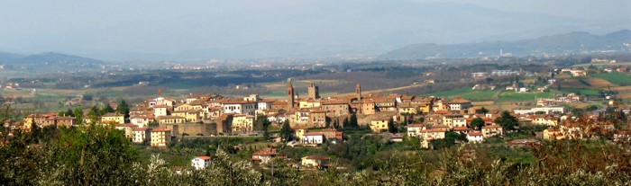 MONTE SAN SAVINO prov. AREZZO * * * La campagna e il paesaggio collinare, in cui armoniosamente Monte San Savino si inserisce con le sue ville e le antiche case coloniche, sono fra i più caratteristici della Valdichiana aretina: campi coltivati a mais e a girasoli, oliveti e vigneti, il cui eccellente prodotto faceva già nel sec. XVII vagheggiare al Redi un calice "indorato / colmo in giro di quel vino / del vitigno / sì benigno, / che fiammeggia in Sansavino". Tutto l’ambiente ne acquisisce una solenne compostezza che non viene meno neanche al passaggio verso la più accentuata rusticità delle zone d’altura. I fitti boschi dove crescono il castagno e la quercia, il leccio, l’abete, i cosiddetti "polloneti", e le varie specie faunistiche che li popolano esercitano una forte attrazione sugli amanti delle passeggiate ecologiche e del birdwatching. Numerose opportunità si offrono al turista anche affrettato che – riservandosi la visita di almeno i principali monumenti cittadini (il Cassero, Santa Chiara, il palazzo Di Monte e le Logge, la pieve e Sant’Agostino) – avrà modo di conoscere ed apprezzare i prodotti dell’artigianato locale e di visitare le botteghe d’antiquariato e modernariato, i laboratori della ceramica di produzione locale (si segnala lo scaldino col fischio che dà anche il nome alla fiera novembrina), le rivendite della porchetta doc, della carne chianina, dei rinomati vini (rosso e bianco vergine della Valdichiana), dell’olio extravergine, e di trovare ancora, da usare per il proprio giardino, una scopa originale di erica. Fra gli altri prodotti gastronomici, è possibile gustare i pici, gli gnocchi, la ribollita, la classica fiorentina e la tagliata, il cinghiale, i contorni di fagioli e, fra i dolci, i caratteristici gnocchi di crema e gli immancabili cantuccini da accompagnarsi col vinsanto. ( dal sito della Pro Loco )