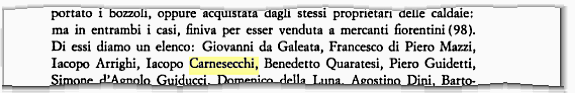 Si parla qui tra i mercanti fiorentini ( ma non sono sicuro fosse fiorentino ) di un IACOPO CARNESECCHI che acquistava seta grezza nella Valdelsa intorno al 1550 (avrebbe potuto essere di Fucecchio o di San Gimignano............... )
