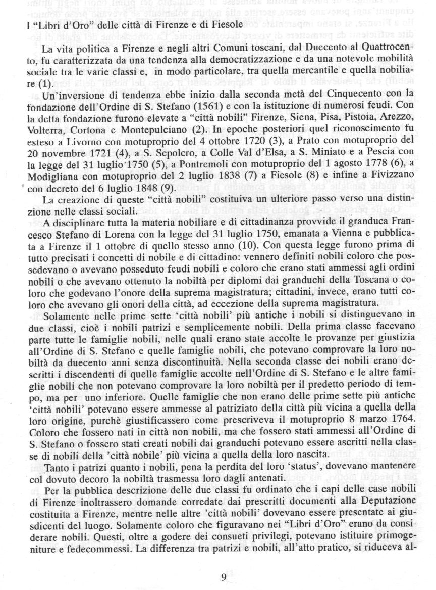 Per levare ogni dubbio circa allo stato delle persone, e distinguere chiaramente tra i nostri fedeli sudditi i veri Nobili, ai quali solamente nella nostra Legge sopra ifidecommissi e primogeniture è piaciuto a noi permettere in avvenire l’instituzione, e per altri giusti motivi ancora, di nostra certa scienza, e colla pienezza della nostra su prema potestà determiniamo e diamo osservarsi rispetto alla nobiltà e cittadinanza di questo nostro Gran-Ducato i seguenti ordini. ( Motup. 31. Luglio 1750. in princ. )