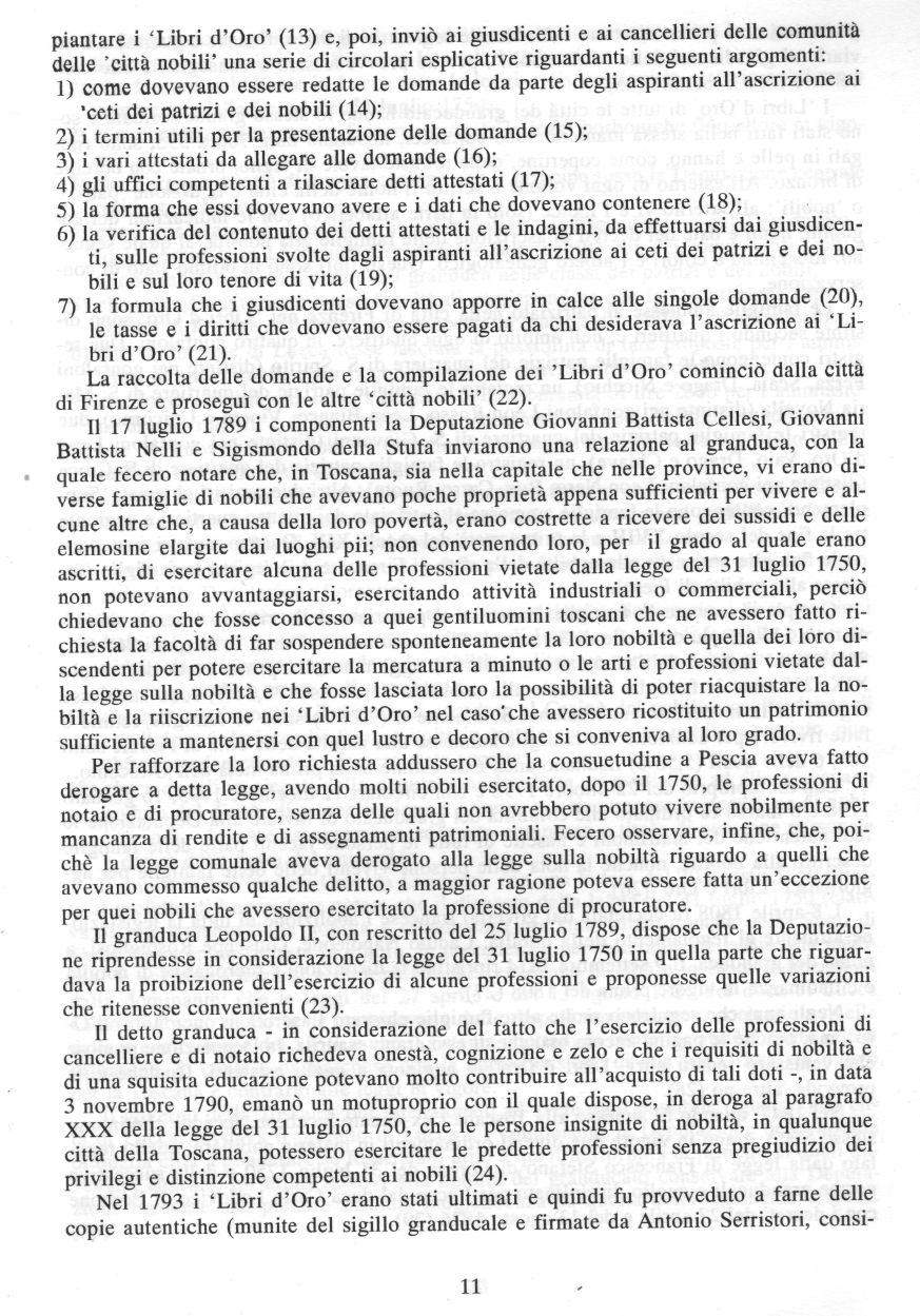 10. All’effetto di far la nuova descrizione, ordiniamo a tutti i capi delle case nobili fiorentine, che a tenore dei medesimi hanno da essere scritti colle loro famiglie nell’una o nell’altra classe, di presentare nel detto Archivio di Palazzo ai Deputati le loro domande coi loro documenti autentici ed in buona forma ; quali documenti e domande parimente vogliamo che in Siena si esibiscano avanti il nostro Auditor generale di quella Città , e nelle restanti Città sopra espresse avanti i respettivi loro Giusdicenti. Questi, compiti i comandati riscontri ai libri esistenti sul luogo, rimetteranno tutto immediatamente ai Deputati sopraddetti, nel modo e forma ordinata loro in detta nostra istruzione. (d. Art. 10.)