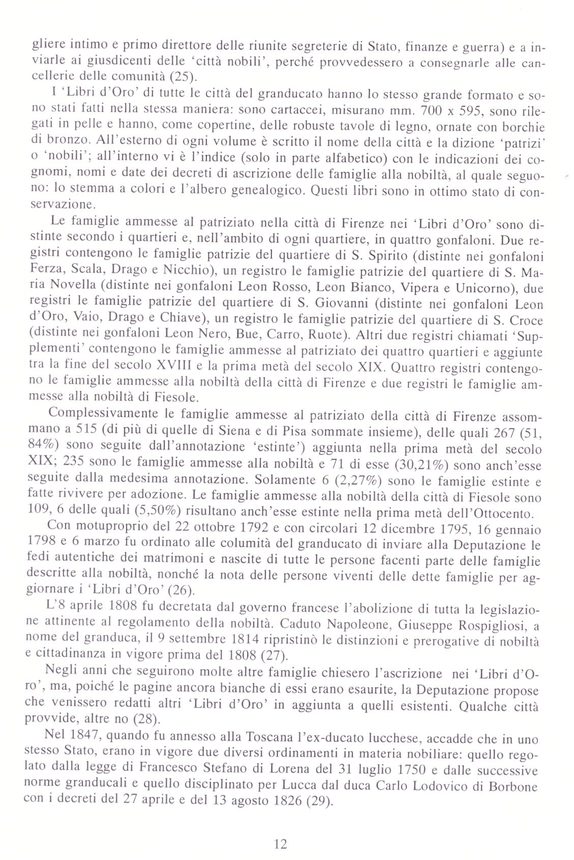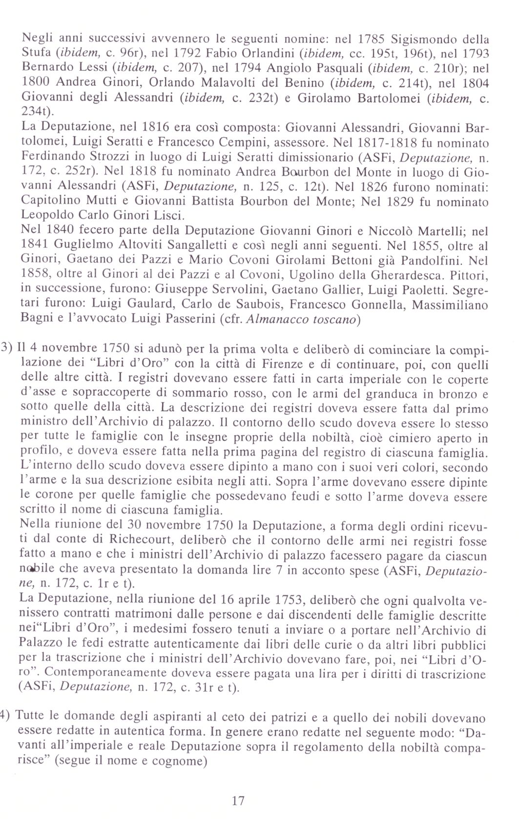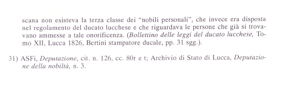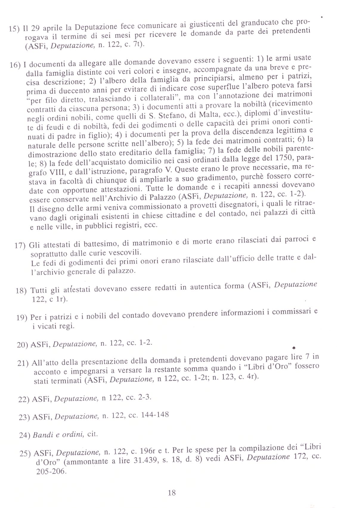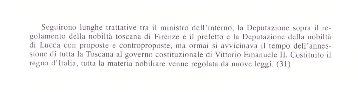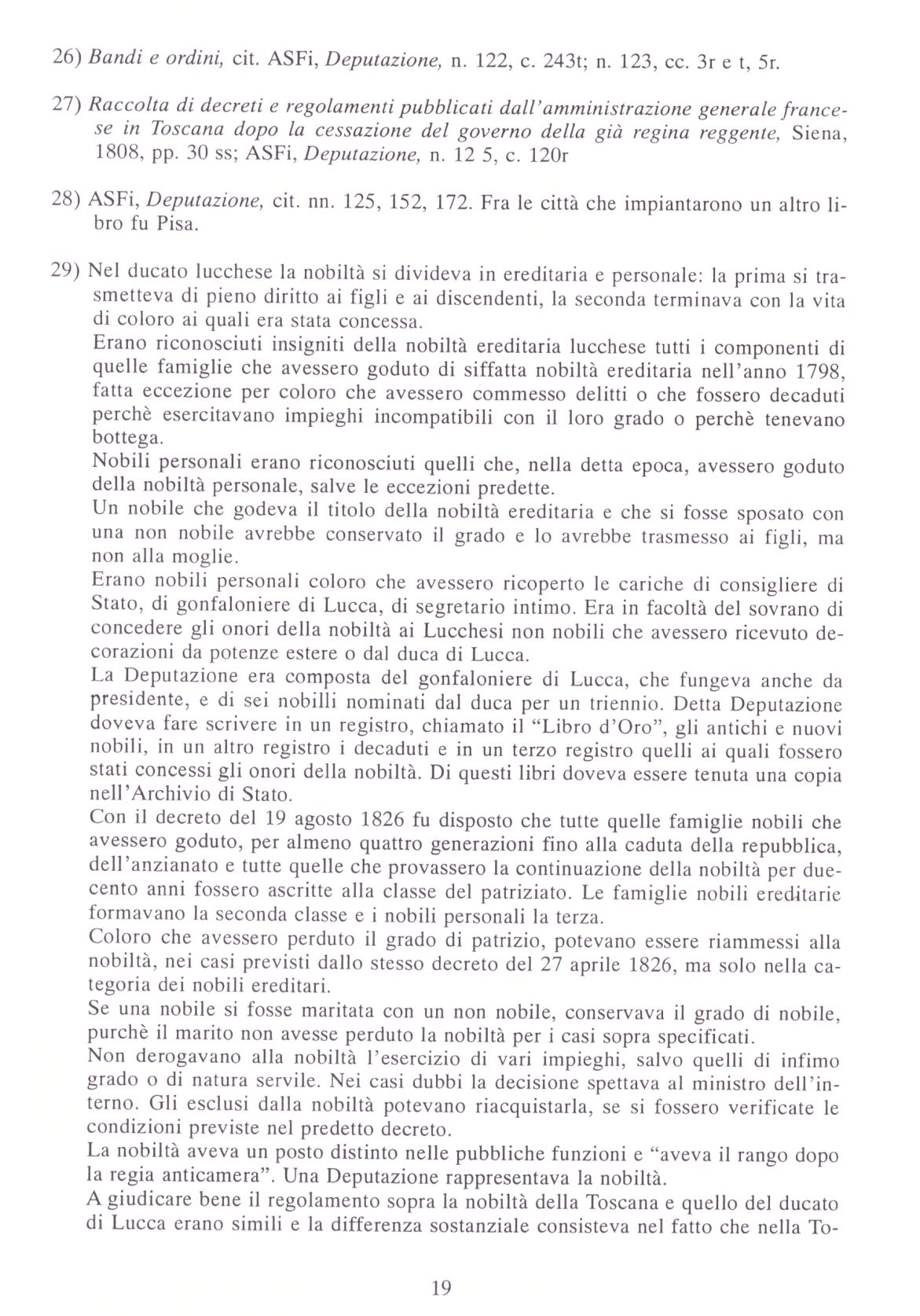 Ciò nonostante, di fronte a casati di evidente condizione nobiliare ma privi del possesso di prove ammissibili, fu la Deputazione ad escogitare stratagemmi atti a sanare situazioni di indubbio prestigio sociale. In più di un caso emerse infatti una spiccata difformità tra i titoli che la legge riconosceva come probatori del possesso di rango, e quelli che invece la tradizione locale considerava tali. Tra le giustificazioni addotte, ma giudicate irrilevanti ai fini della registrazione, apparvero veri e propri capisaldi della nobiltà toscana quali la titolarità dell’antica cittadinanza fiorentina, l’aver contribuito alla fondazione di cappelle, l’ammissione a una Accademia nobiliare e l’aver ricevuto donazioni dotali da parte di una granduchessa38.