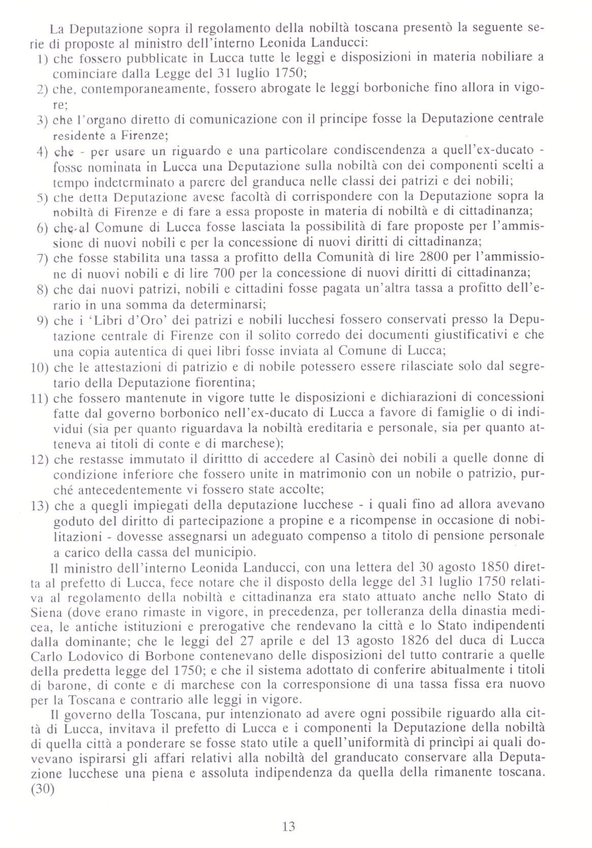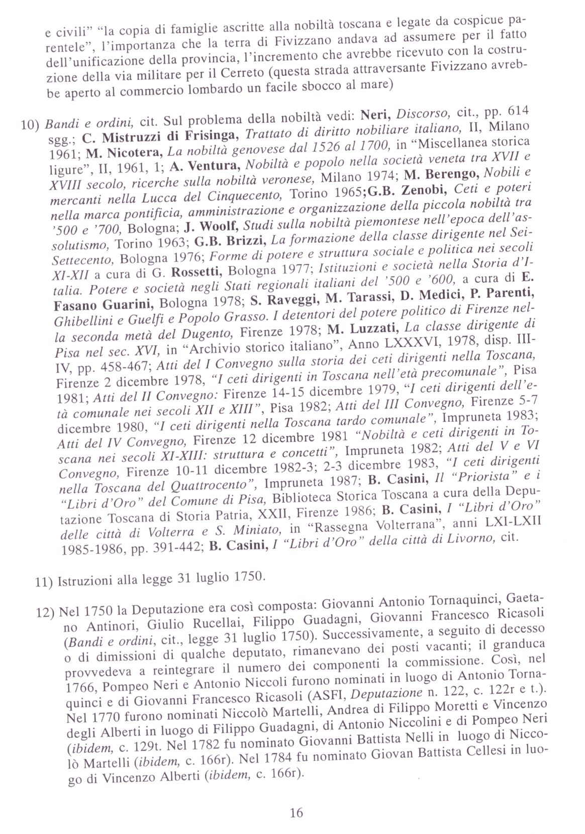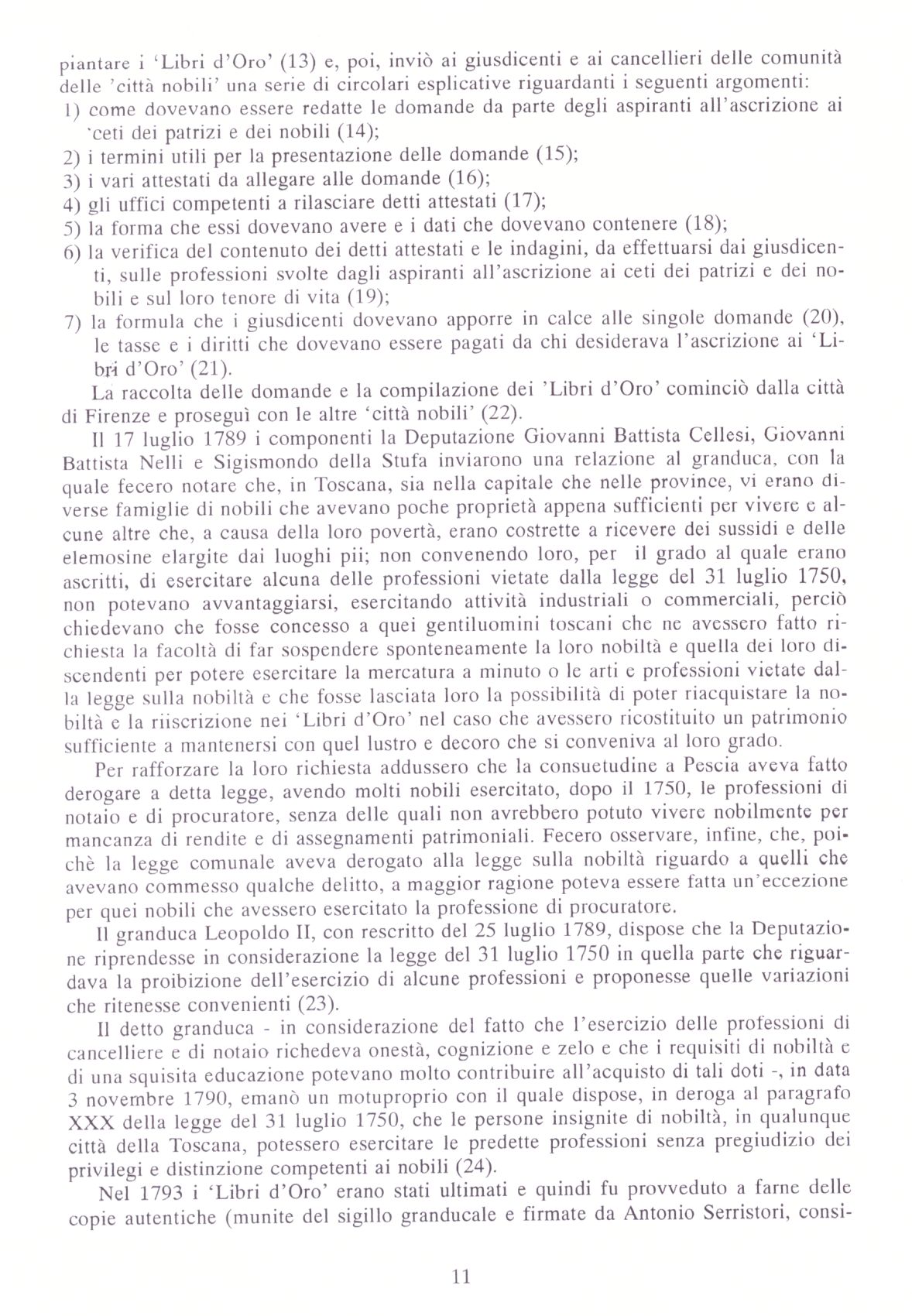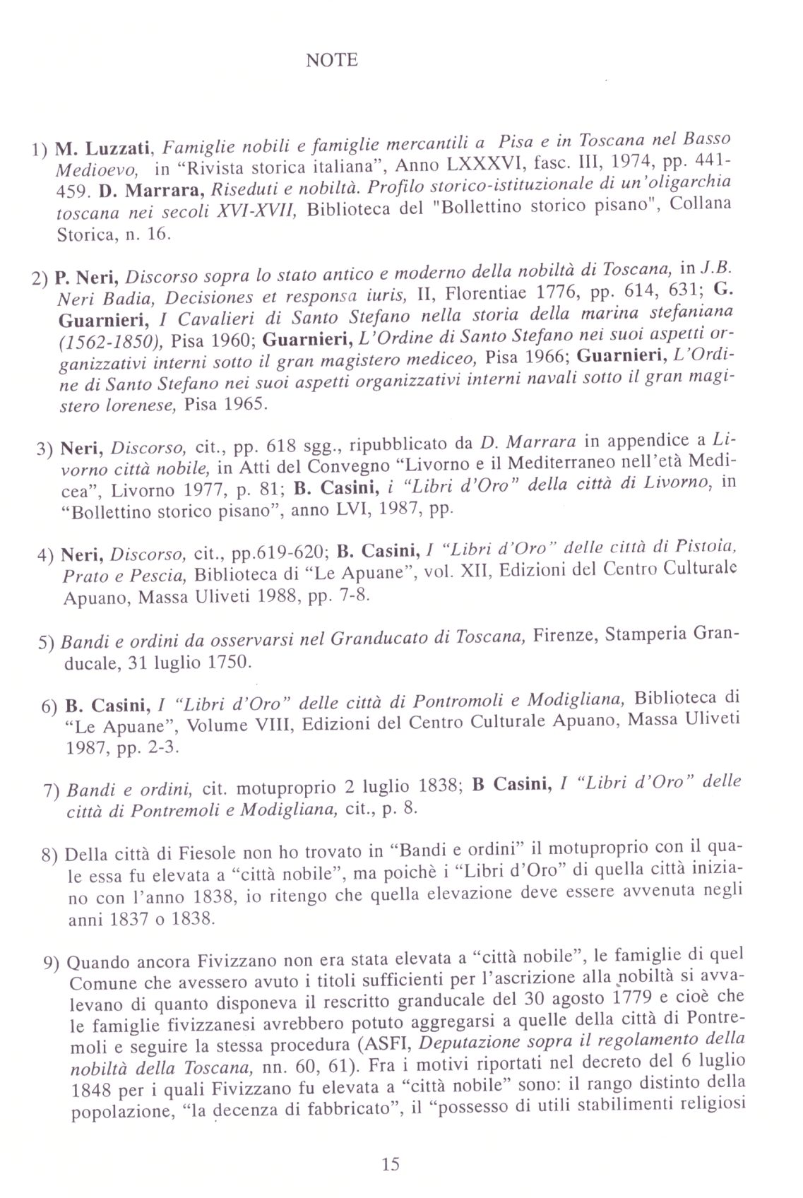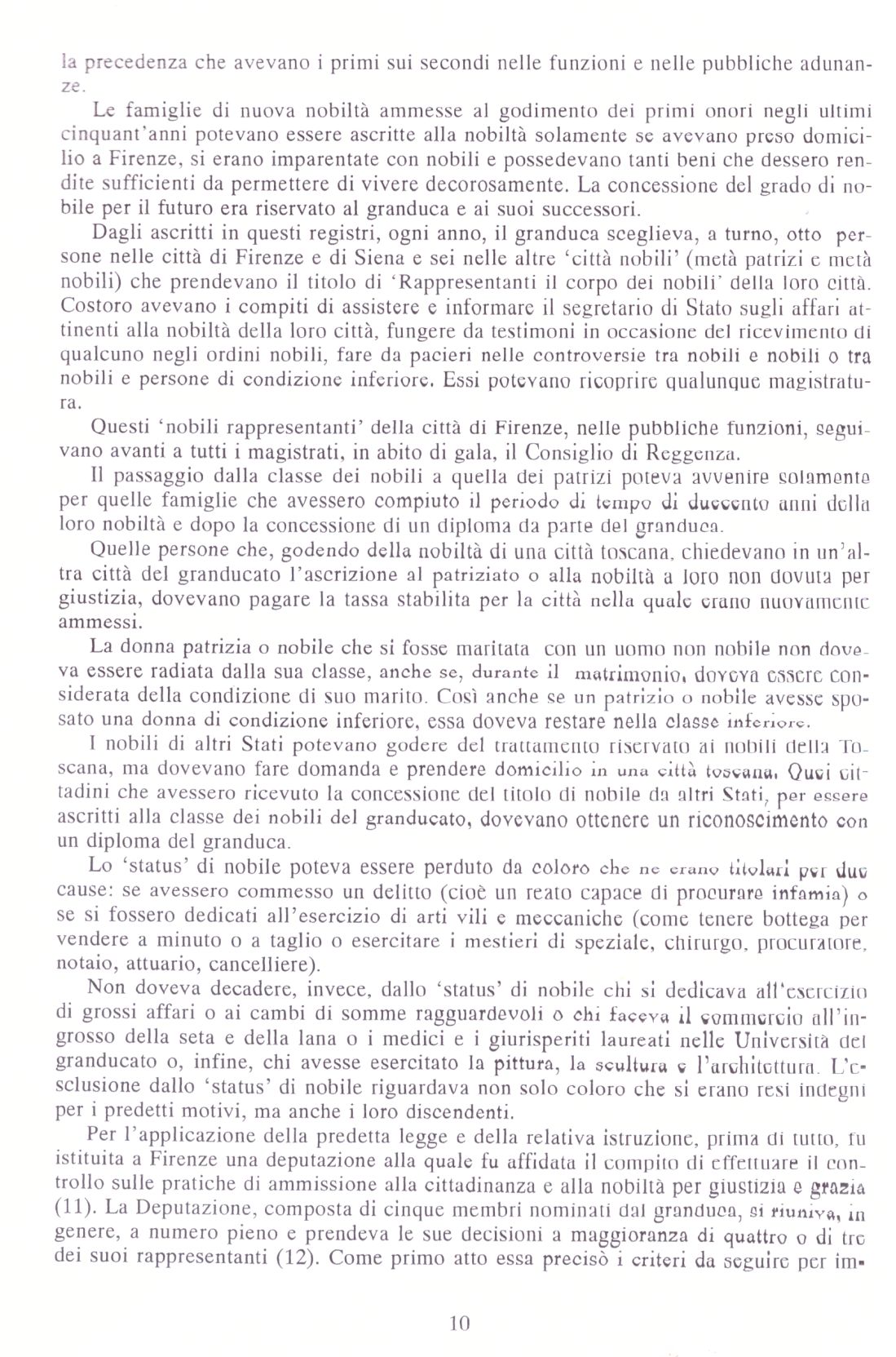 Ciò nonostante, di fronte a casati di evidente condizione nobiliare ma privi del possesso di prove ammissibili, fu la Deputazione ad escogitare stratagemmi atti a sanare situazioni di indubbio prestigio sociale. In più di un caso emerse infatti una spiccata difformità tra i titoli che la legge riconosceva come probatori del possesso di rango, e quelli che invece la tradizione locale considerava tali. Tra le giustificazioni addotte, ma giudicate irrilevanti ai fini della registrazione, apparvero veri e propri capisaldi della nobiltà toscana quali la titolarità dell’antica cittadinanza fiorentina, l’aver contribuito alla fondazione di cappelle, l’ammissione a una Accademia nobiliare e l’aver ricevuto donazioni dotali da parte di una granduchessa38.