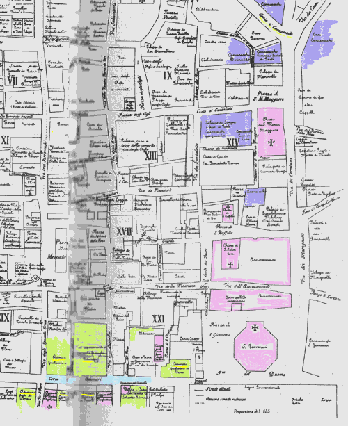 Si confronti ora la posizione delle case dei Carnesecchi in blu rispetto a quelle degli Adimari in verde (Corso degli Adimari ,ora via Calzaioli ) subito alle spalle di San Giovanni