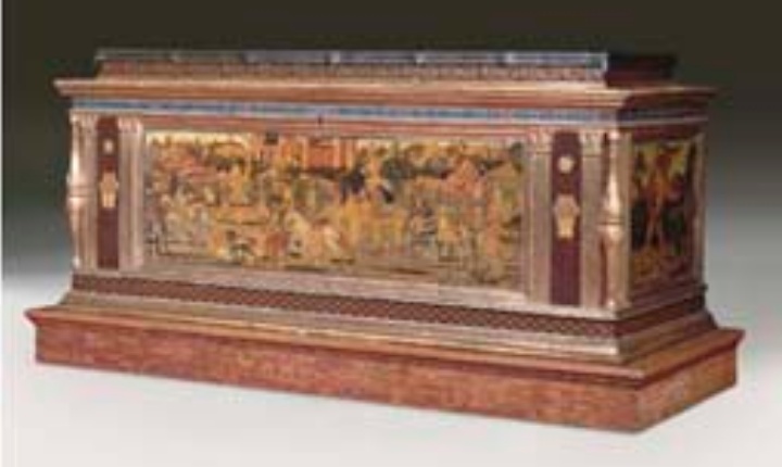 Attributed to Giovanni di Ser Giovanni Guidi, Lo Scheggia (San Giovanni Valdarno, nr. Arezzo 1406-1486 Florence) A Cassone: central panel: The Triumph of David; testate (end panels): Hercules and the Lernaean Hydra; and Hercules saving Deianeira from Nessus, all three panels inset into an Italian Baroque-style polychrome-painted, parcel-gilt cassone, probably 19th Century and incorporating earlier elements, with restorations and additions; and the arms of Carnesecchi and Lanfredini families tempera and silver on gold ground panel central panel: 15 5/8 x 51¼ in. (39.7 x 130.2 cm.); end panels: 15 7/8 x 19¾ in. (40.3 x 50.2 cm.); the Cassone overall: 27¼ in. (69.2 cm.) high, 74 1/8 in. (188.3 cm.) wide, 27 5/8 in. (70.2 cm.) deep Provenance The central panel possibly supplied for the marriage of Giuliano Carnesecchi and Cassandra Lanfredini, in 1467. [Presumably] Sir Francis Cook, 1st Bt., Visconde de Monserrate (1817-1901) and by descent in the Smoking Room at Doughty House, Richmond, Surrey, to Sir Francis Cook, 4th Bt. (1907-1978), the late husband of Brenda, Lady Cook.