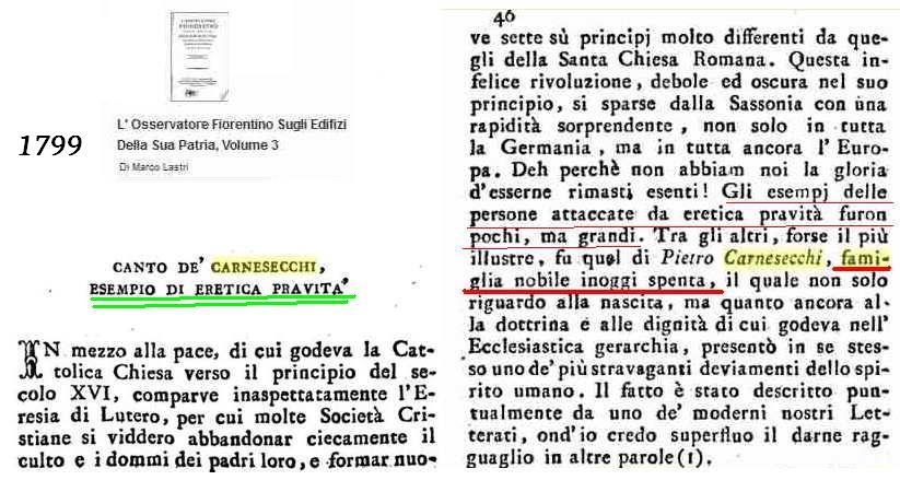 Insomma la mancanza di compenso monetario e una macchia religiosa per quei tempi oltraggiosa furono buoni motivi perche' gli eruditi non si occupassero o se ne occupassero molto molto superficialmente nonostante la tanta storia a cui i Carnesecchi fiorentini avevano partecipato e che non avrebbe dovuto essere ignorata